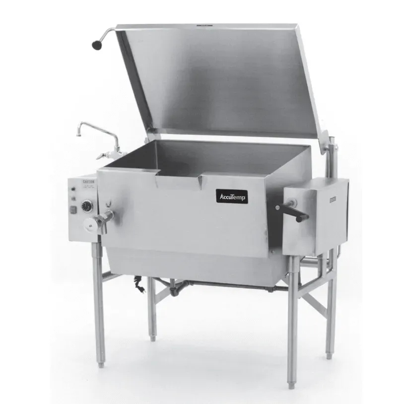 Elevate Your Culinary Arsenal with the AccuTemp ALTGSE-30 Tilting Skillet Braising Pan. Designed for commercial restaurant use, this gas-powered skillet boasts a generous 30-gallon capacity, perfect for preparing large quantities of delicious meals. The thermostatically controlled temperature ensures precise cooking results, while the self-locking worm gear and tilt mechanism make it easy to pour out your culinary creations. The heavy-duty actuator-assisted cover comes with a condensate drip shield and cover vent, keeping your food fresh and flavorful. With its 304 stainless steel and clad pan body construction, this skillet is built to withstand the demands of a busy kitchen. The optional direct spark ignition combination gas control adds convenience and efficiency to your cooking process. Complete with a sturdy tubular leg stand, this skillet delivers exceptional performance with its 90,000 BTU power. Trust AccuTemp to enhance your restaurant's efficiency and culinary prowess.