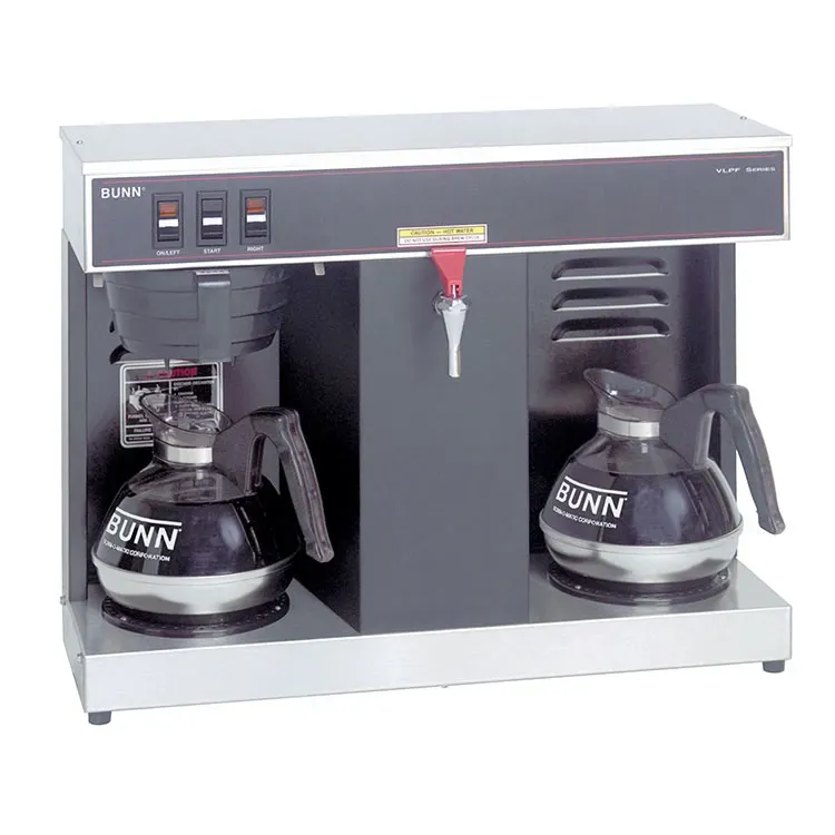 Enhance the dining experience with precision utensils. Introducing the Bunn 07400.0005 Coffee Brewer for Decanters. Designed for commercial restaurant use, this automatic coffee brewer delivers a capacity of 3.8 gallons (14.4 liters) per hour, ensuring a steady supply of delicious coffee for your customers. With two lower warmers, you can keep multiple decanters of coffee hot and ready to serve. The hot water faucet allows for convenient tea and hot water dispensing. The SplashGard funnel prevents hot liquid from splashing, ensuring safety and cleanliness. The black decor adds a sleek and professional touch to any restaurant setting. This coffee brewer operates on 120v/60/1-ph power, with a cord attached for easy installation. UL and NSF certified, you can trust in the quality and reliability of this Bunn coffee brewer. Upgrade your restaurant's coffee service with the Bunn 07400.0005 Coffee Brewer for Decanters.