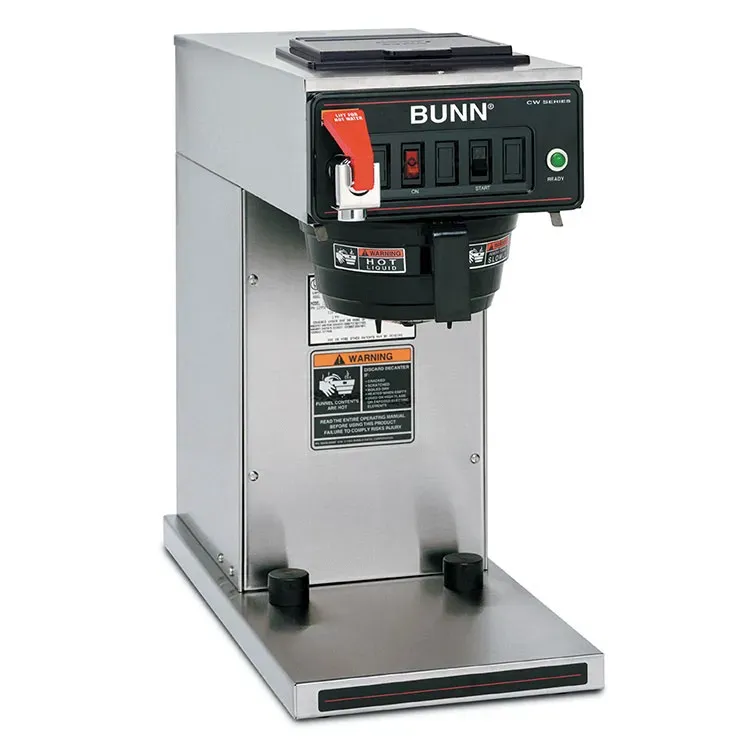 Stay competitive with kitchen innovations with the Bunn, 12950.0360, Coffee Brewer for Thermal Server. This automatic brewer is designed to meet the demands of a busy commercial restaurant. With a capacity of 3.9 gallons per hour, it ensures a steady supply of hot, delicious coffee for your customers. The stainless steel construction not only adds durability but also gives it a sleek and professional look. The SplashGard funnel prevents hot liquid from splashing, ensuring safety and cleanliness. The brewer also features a hot water faucet, allowing you to easily dispense hot water for tea or other hot beverages. With plumbed water access and a pour-over feature, you have the flexibility to use it with or without a water line. It accepts thermal carafes up to 8-1/2" tall, providing versatility for different serving sizes. Invest in the Bunn Coffee Brewer for Thermal Server and elevate your restaurant's coffee service to the next level.