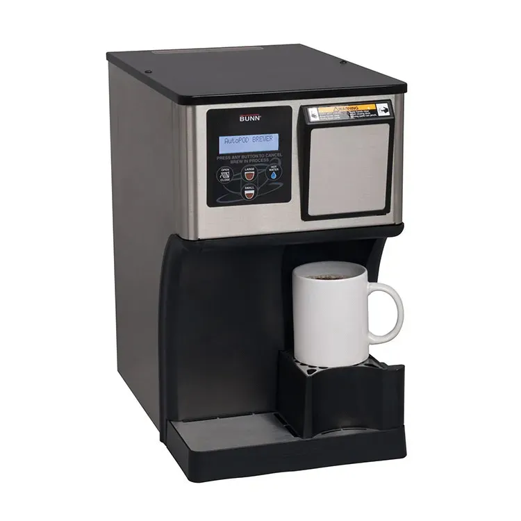 Introducing the Bunn 42300.0000 Coffee Brewer, designed specifically for single cup brewing in commercial restaurant settings. This automatic brewer is a game-changer, delivering a piping hot cup of coffee or tea in less than a minute. With the ability to brew up to 16 oz. per serving, it ensures your customers never have to wait long for their favorite beverage. The innovative AutoPOD feature automatically disposes of spent pods into a removable bin, holding up to 25 pods at a time. The digital display, available in English and Spanish, makes operation a breeze. Need hot water? Simply push and hold the hot water button to dispense up to 10 oz. The integrated cup booster allows for 5" or 8" cup clearance, accommodating various cup sizes. With energy-saving mode and ETL and NSF certifications, the Bunn 42300.0000 is a reliable and efficient choice for any commercial restaurant.