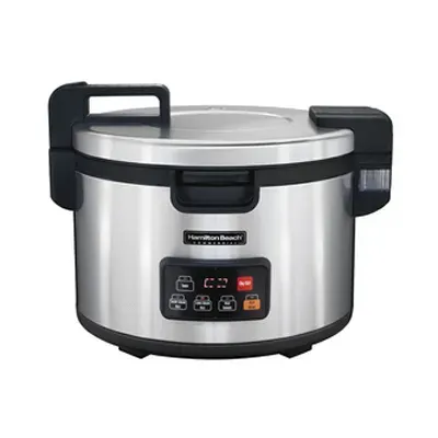 Revolutionize your cooking setup with the Hamilton Beach 37590 Rice/Grain Cooker. Designed for commercial restaurant use, this rice cooker/warmer is a game-changer in the kitchen. With a 90 cup capacity, it can handle large quantities of rice with ease, making it perfect for busy restaurants and catering services. The digital control panel allows for precise temperature and cooking time adjustments, ensuring perfectly cooked rice every time. The non-stick pot and heated/lined lid with a trigger handle make serving and cleaning a breeze. The double-wall stainless steel construction provides excellent insulation, keeping rice warm for extended periods. Lift handles and a moisture cup add convenience and functionality. This cETLus and ETL-Sanitation certified rice cooker/warmer from Hamilton Beach is a reliable and durable addition to any commercial kitchen. Upgrade your restaurant's rice cooking capabilities with the Hamilton Beach 37590 Rice/Grain Cooker.