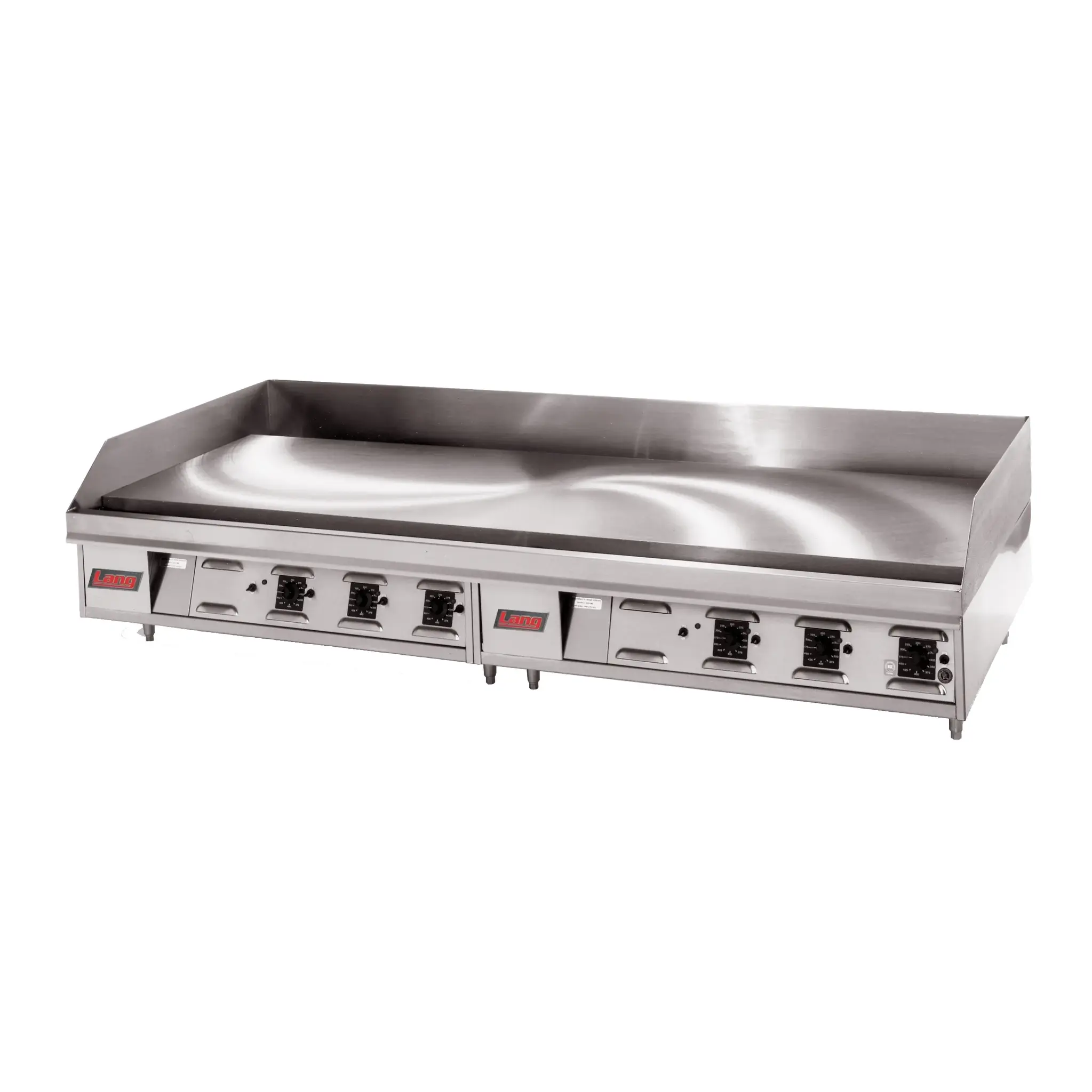 Enhance Your Restaurant's Efficiency with the Lang Manufacturing 260TC Gas Countertop Griddle. This high-quality griddle is designed to meet the demands of a commercial restaurant setting, offering a spacious 60" W x 23" D cooking surface. The 1" thick chrome griddle plate ensures even heat distribution and excellent heat retention, allowing for precise cooking results. With embedded electric snap-action thermostats and pilot safety, you can easily adjust the temperature from 200 to 450 degrees Fahrenheit. The welded steel frame and stainless steel exterior provide durability and easy cleaning. The 5" tapered wrap-around splash guard and 3-1/2" front grease trough help to maintain a clean and safe cooking environment. The 8 qt. stainless steel grease drawer ensures convenient grease disposal. With 135,000 BTU of power, this griddle delivers exceptional performance. Upgrade your restaurant's cooking capabilities with the Lang Manufacturing 260TC Gas Countertop Griddle.