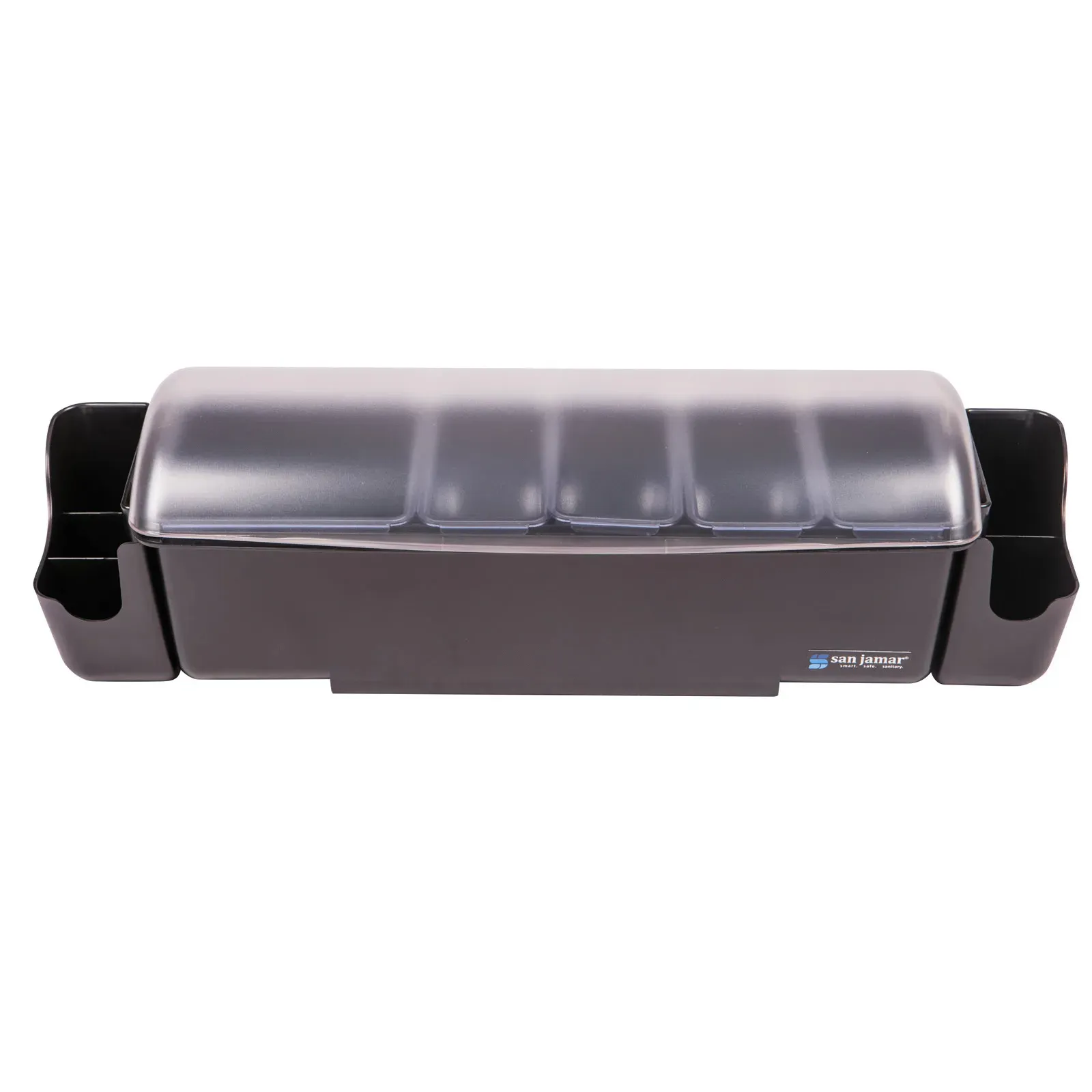 Optimize reliability with the San Jamar BD4005S Bar Condiment Holder. This garnish center is designed to enhance efficiency and organization in commercial restaurant settings. With its semi-transparent polycarbonate domed cover, you can easily identify and access the condiments you need. The black polycarbonate base adds durability and a sleek appearance to any bar or kitchen setup. The holder can accommodate a 2 qt. deep tray and four 1 pint standard trays, providing ample space for a variety of condiments. Additionally, the two snap-on caddies and included handles offer convenience and ease of use. As a trusted brand in the industry, San Jamar ensures the highest quality with NSF certification. Elevate your restaurant's condiment organization with the San Jamar BD4005S Bar Condiment Holder.