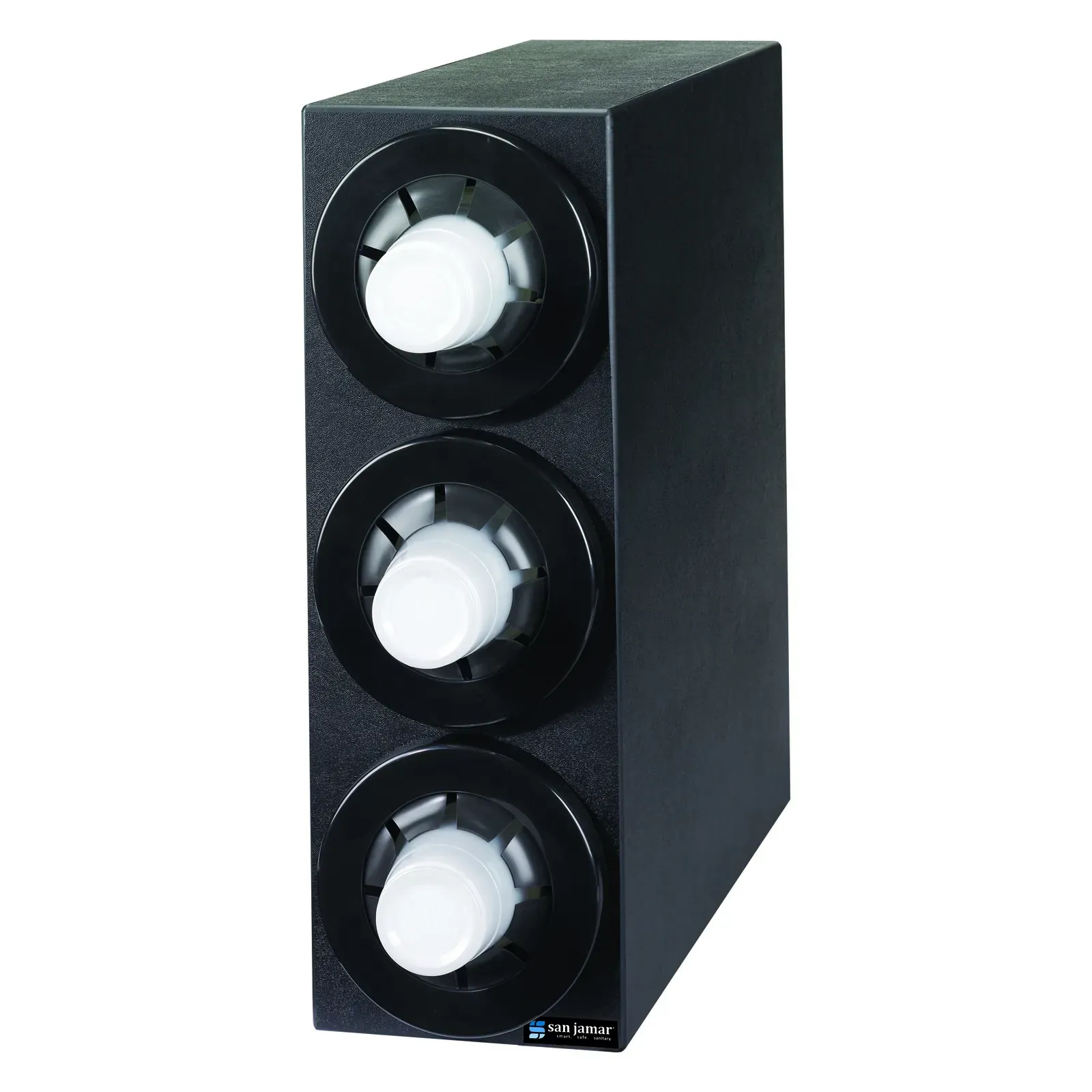 Maximize efficiency with the San Jamar C2953BK Cup Dispensers. Designed for commercial restaurant use, this countertop unit is a must-have for any busy establishment. The Sentry Beverage Cabinet measures 7-3/4"L x 23-3/4"W x 24-3/4"H and comes with three cup dispensers (C5450C) for easy access to cups. The black trim rings and polystyrene construction give it a sleek and durable look, while the NSF certification ensures its safety and quality. With a packed case by San Jamar, this cup dispenser is ready to be put to work in your restaurant. Whether you're serving hot or cold beverages, this dispenser will keep your cups organized and within reach, saving you time and effort. Upgrade your restaurant's efficiency with the San Jamar C2953BK Cup Dispensers.