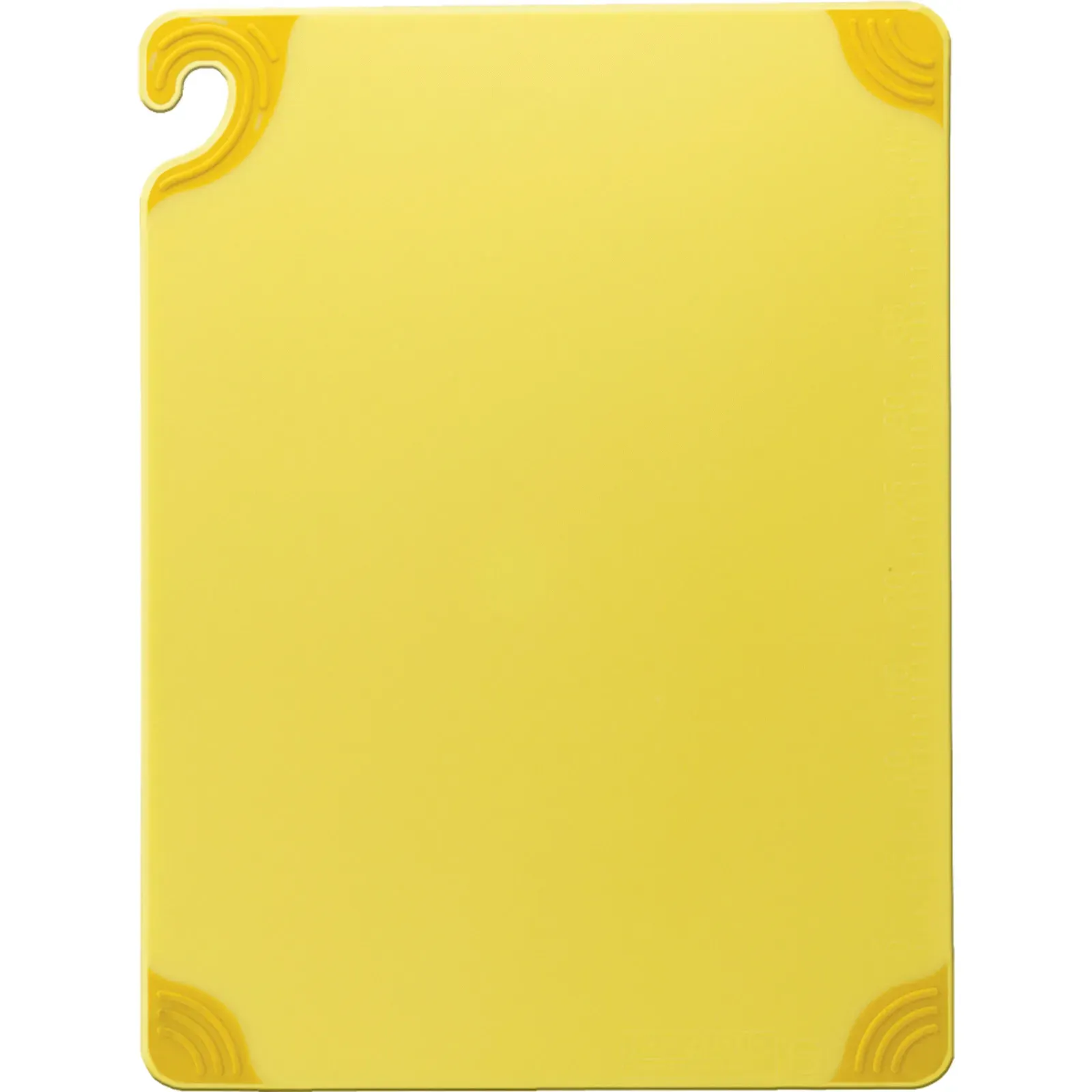 Introducing the San Jamar CBG121812YL Cutting Board, a must-have tool for any commercial restaurant. Foster creativity with this high-quality, co-polymer cutting board that is designed to enhance food preparation efficiency and safety. The board features anti-slip grip corners, ensuring stability during use, while the integrated ruler allows for precise measurements. Its vibrant yellow color adds a pop of brightness to your kitchen, making it easy to differentiate between different food types and prevent cross-contamination. The food safety hook provides a convenient storage solution, keeping your workspace organized and clutter-free. Dishwasher safe and NSF certified, this cutting board is easy to clean and meets the highest standards of food safety.