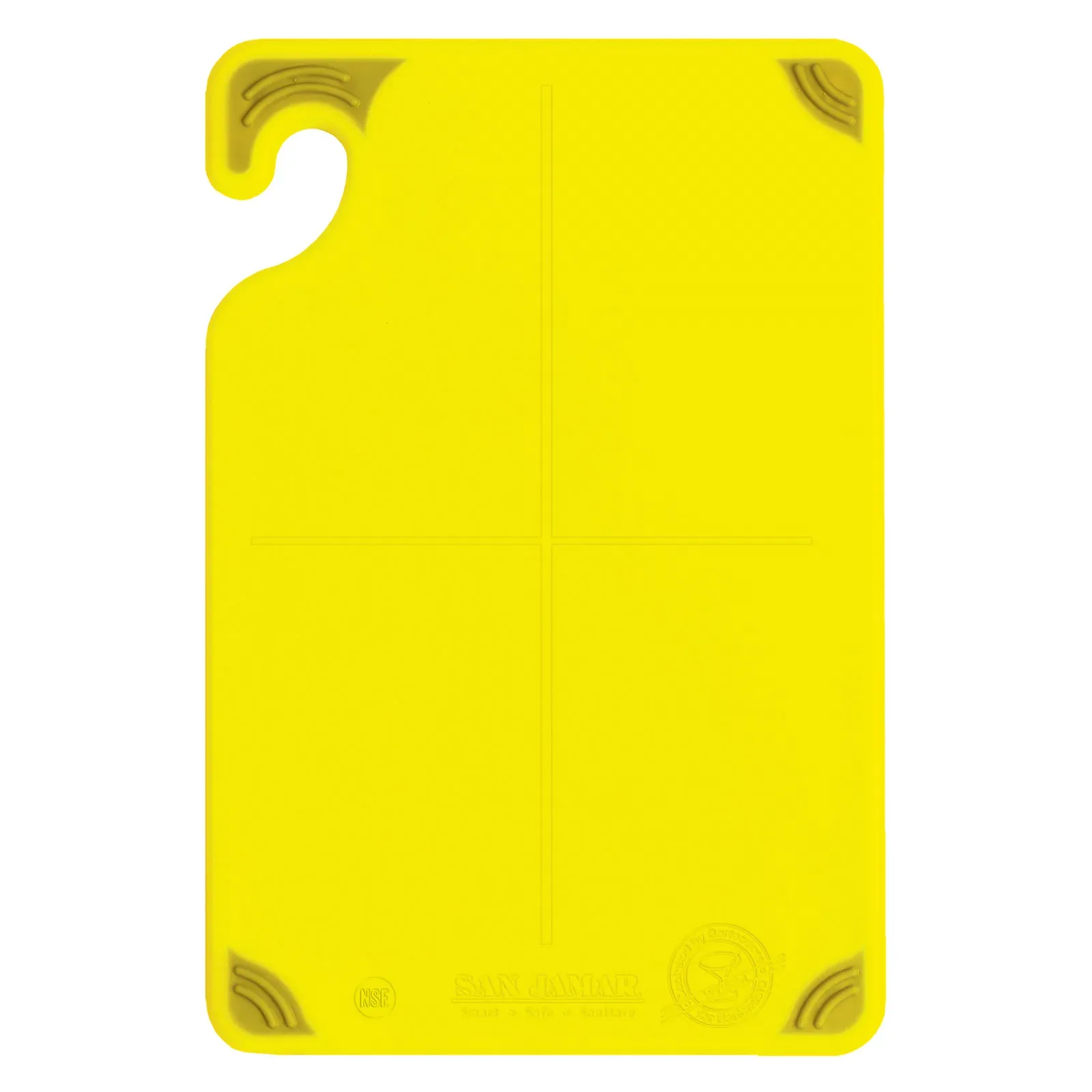 Introducing the San Jamar CBG6938YL Cutting Board, a must-have tool for any commercial restaurant. This high-quality plastic cutting board is designed to foster innovation in your kitchen, ensuring efficiency and food safety. With its anti-slip grip corners and integrated ruler, you can confidently slice and dice ingredients with precision. The vibrant yellow color not only adds a pop of brightness to your workspace but also serves as a visual reminder to separate different types of food to prevent cross-contamination. The food safety hook allows for easy storage and accessibility, while the dishwasher-safe co-polymer material ensures quick and thorough cleaning. NSF certified, this cutting board meets the highest standards of hygiene and durability.