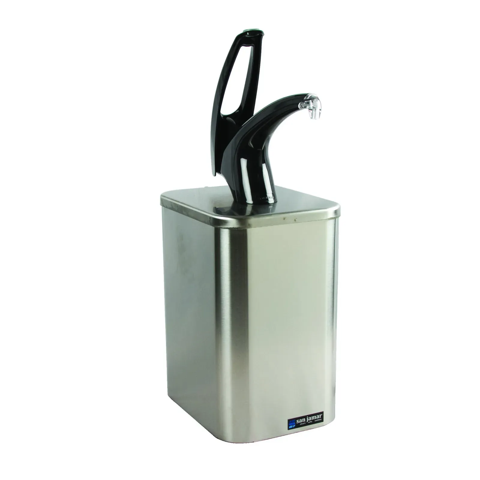 Foster modernity with the San Jamar P4900BK Condiment Dispenser Pump-Style. This sleek and efficient countertop box system is designed to enhance the condiment dispensing experience in commercial restaurants. The 22-gauge stainless steel box and tamper-resistant lid ensure durability and security, while the plastic pump and condiment liner provide easy and mess-free dispensing. The included Cryovac bag adapter and dip tube allow for convenient refilling, minimizing downtime. With its black pump and NSF certification, this dispenser is not only functional but also adds a touch of sophistication to any restaurant setting. Whether you're serving ketchup, mustard, or salad dressings, the San Jamar P4900BK is the perfect solution for keeping condiments organized and easily accessible. Upgrade your condiment station and impress your customers with this high-quality dispenser.