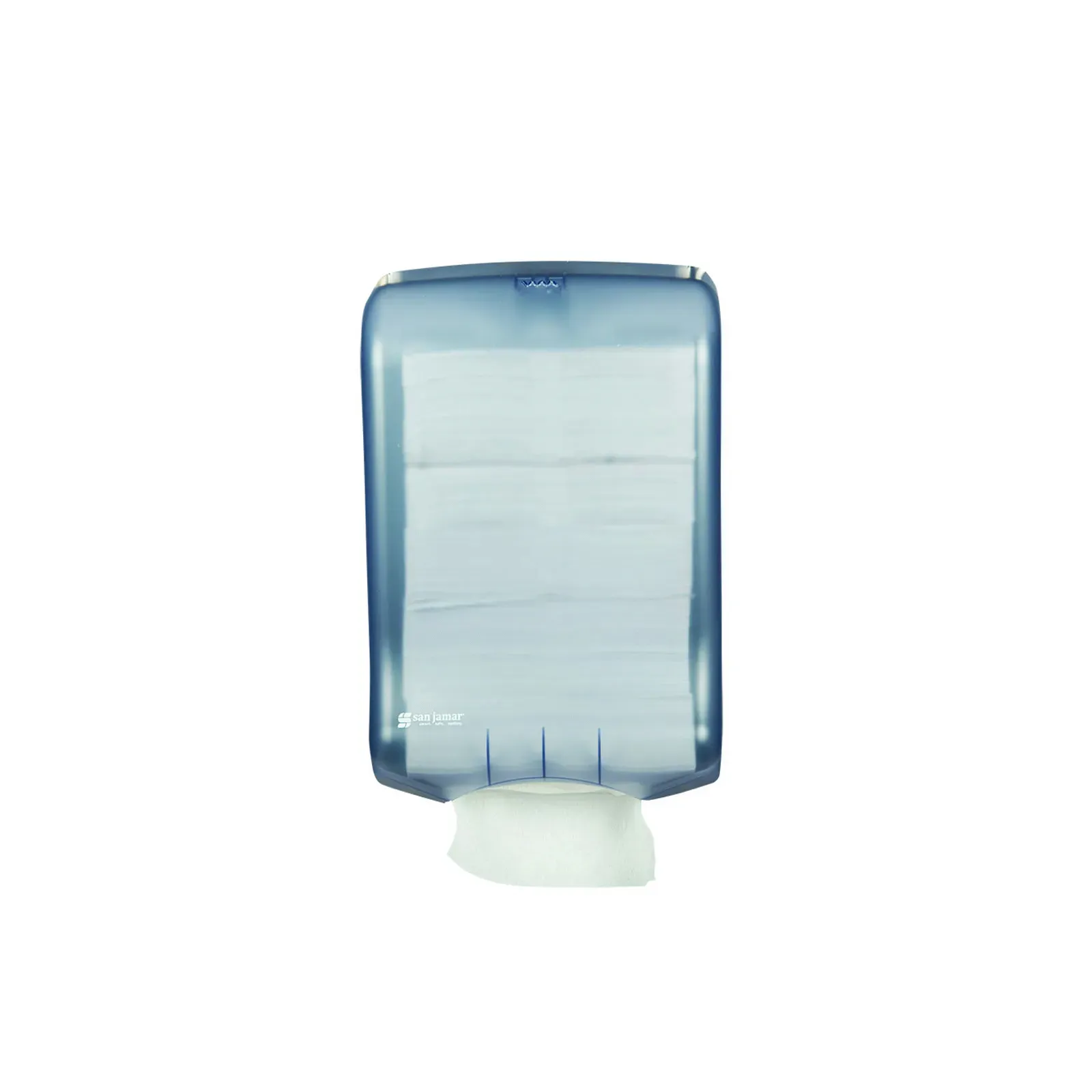 Ensure efficiency with the San Jamar T1700TBL Paper Towel Dispenser. Designed for commercial restaurant use, this dispenser holds c-fold and multifold towels, providing a convenient and hygienic solution for hand drying. With its compact size of 11-3/4"W x 6-1/4"D x 18"H, it can be easily mounted on walls or placed on countertops, saving valuable space in busy kitchens. The translucent arctic blue color adds a touch of style while allowing for easy monitoring of towel levels. The ultrafold design ensures smooth and controlled dispensing, reducing waste and promoting cost-effectiveness. Trust San Jamar, a reputable vendor in the industry, to deliver a durable and reliable product that meets the demands of any commercial restaurant. Upgrade your establishment with the San Jamar T1700TBL Paper Towel Dispenser today.