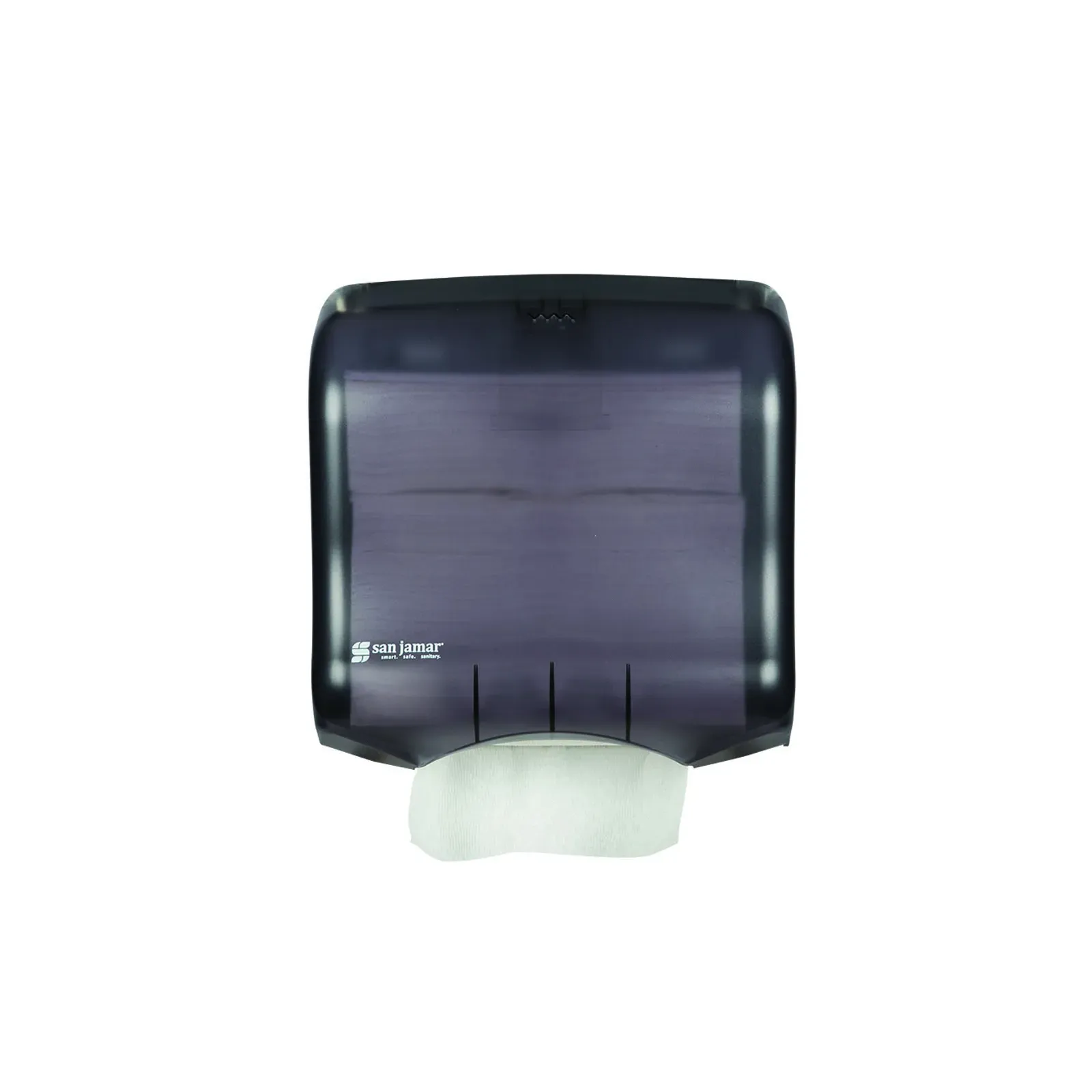 Introducing the San Jamar T1750TBK Paper Towel Dispenser, the perfect addition to any commercial restaurant setting. This compact dispenser is designed to optimize performance, ensuring that your restaurant runs smoothly and efficiently. With its durable and impact-resistant plastic construction, this dispenser is built to withstand the demands of a busy kitchen. The translucent black pearl finish adds a touch of elegance to your space while allowing you to easily monitor towel levels. The dispenser features a lock and Present System, providing added security and convenience. It can hold up to 240 C-fold or 400 multifold towels, ensuring that your staff and customers always have access to clean and hygienic hand drying options. Trust San Jamar, a trusted name in the industry, to deliver quality and reliability. Upgrade your restaurant today with the San Jamar T1750TBK Paper Towel Dispenser.
