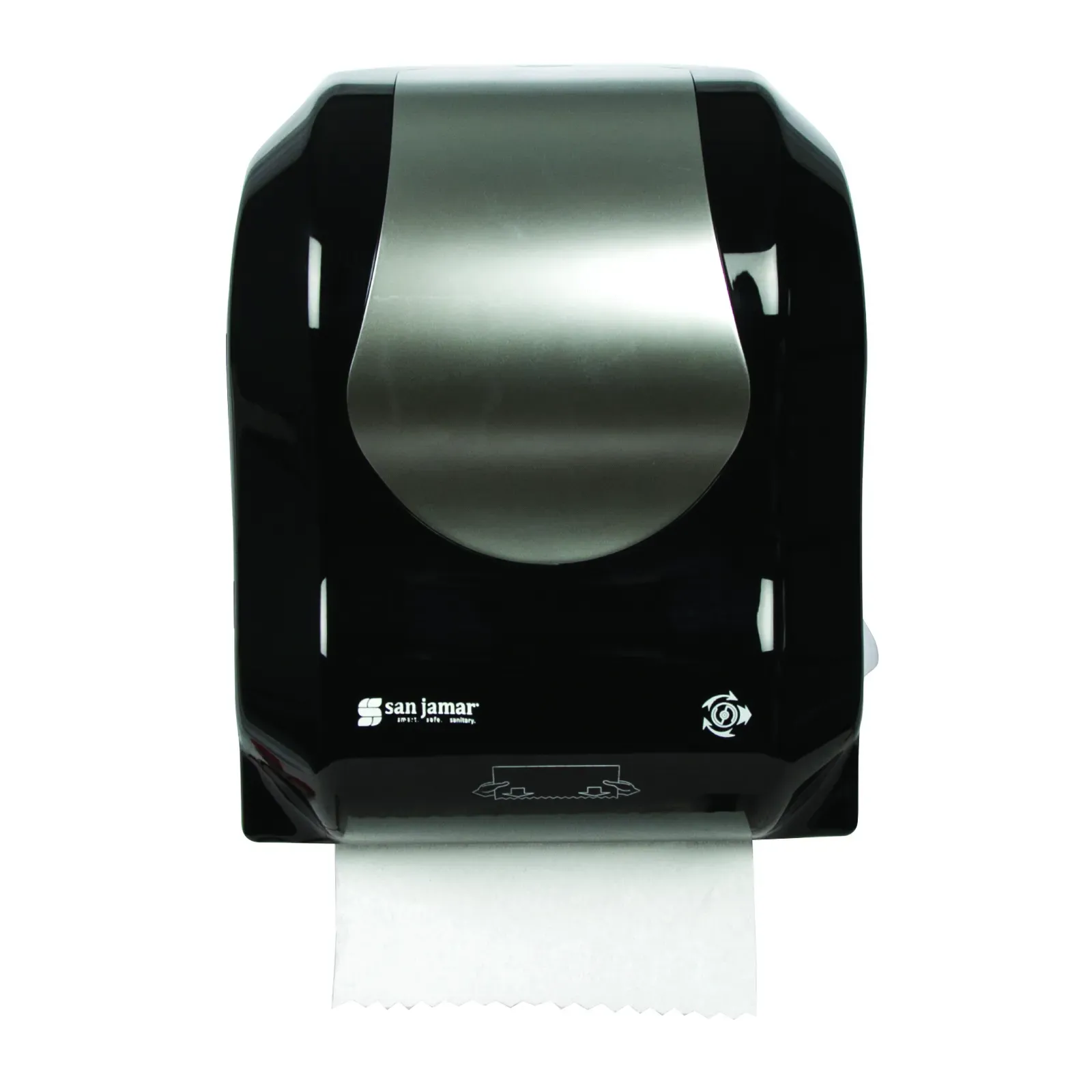 Enhance quality with the San Jamar T7470BKSS Paper Towel Dispenser. Designed for commercial restaurant use, this dispenser combines simplicity and functionality to provide a convenient and hygienic solution for hand drying. The automatic mechanical cutting feature ensures a consistent 10" portion of roll towel, reducing waste and promoting cost-efficiency. With its impact-resistant plastic construction and lockable design, this dispenser is built to withstand the demands of a busy restaurant environment. The black/stainless look adds a touch of sophistication to any restroom or kitchen area. No batteries are required, making it a reliable and low-maintenance option. Measuring 12-3/8"W x 9-1/2"D x 16-1/2"H, it fits one 8" wide roll, providing ample supply for high-traffic areas. Trust San Jamar, a reputable vendor in the paper towel dispenser category, to deliver a durable and efficient solution for your restaurant needs.