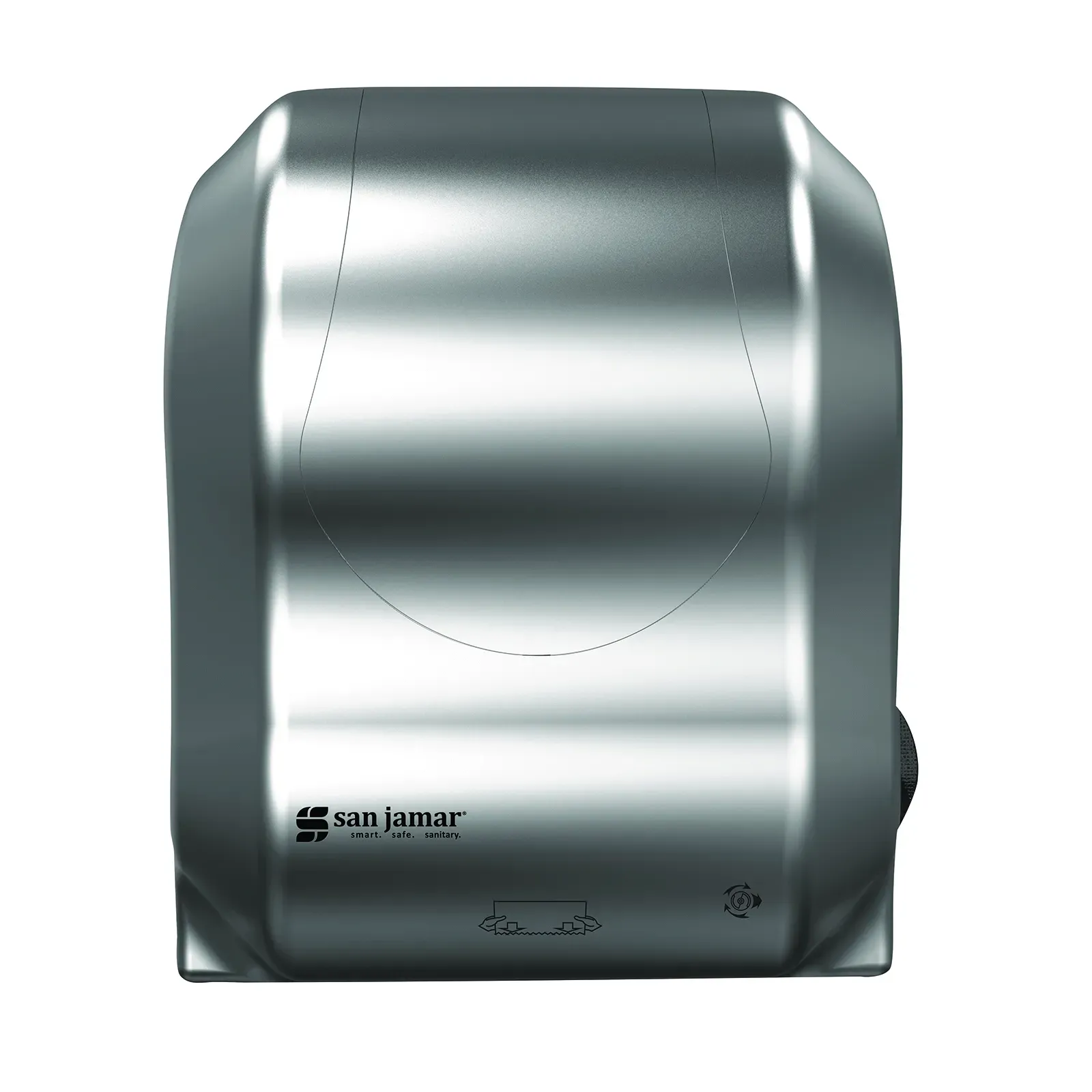 Elevate standards with the San Jamar T7470SS Paper Towel Dispenser. This sleek and durable dispenser is designed specifically for commercial restaurant use, ensuring that your establishment maintains the highest level of cleanliness and efficiency. With its automatic mechanical cutting feature, you can easily access a consistent 10" portion of roll towel, reducing waste and saving you money. The dispenser fits an 8" wide roll and requires no batteries, making it a cost-effective and hassle-free solution. Made from impact-resistant plastic with a stainless steel-look, this dispenser is not only stylish but also built to withstand the demands of a busy restaurant environment. Its wall-mount design with a lock provides added security and convenience. Trust San Jamar, a trusted name in the industry, to deliver a reliable and functional paper towel dispenser that meets your restaurant's needs.