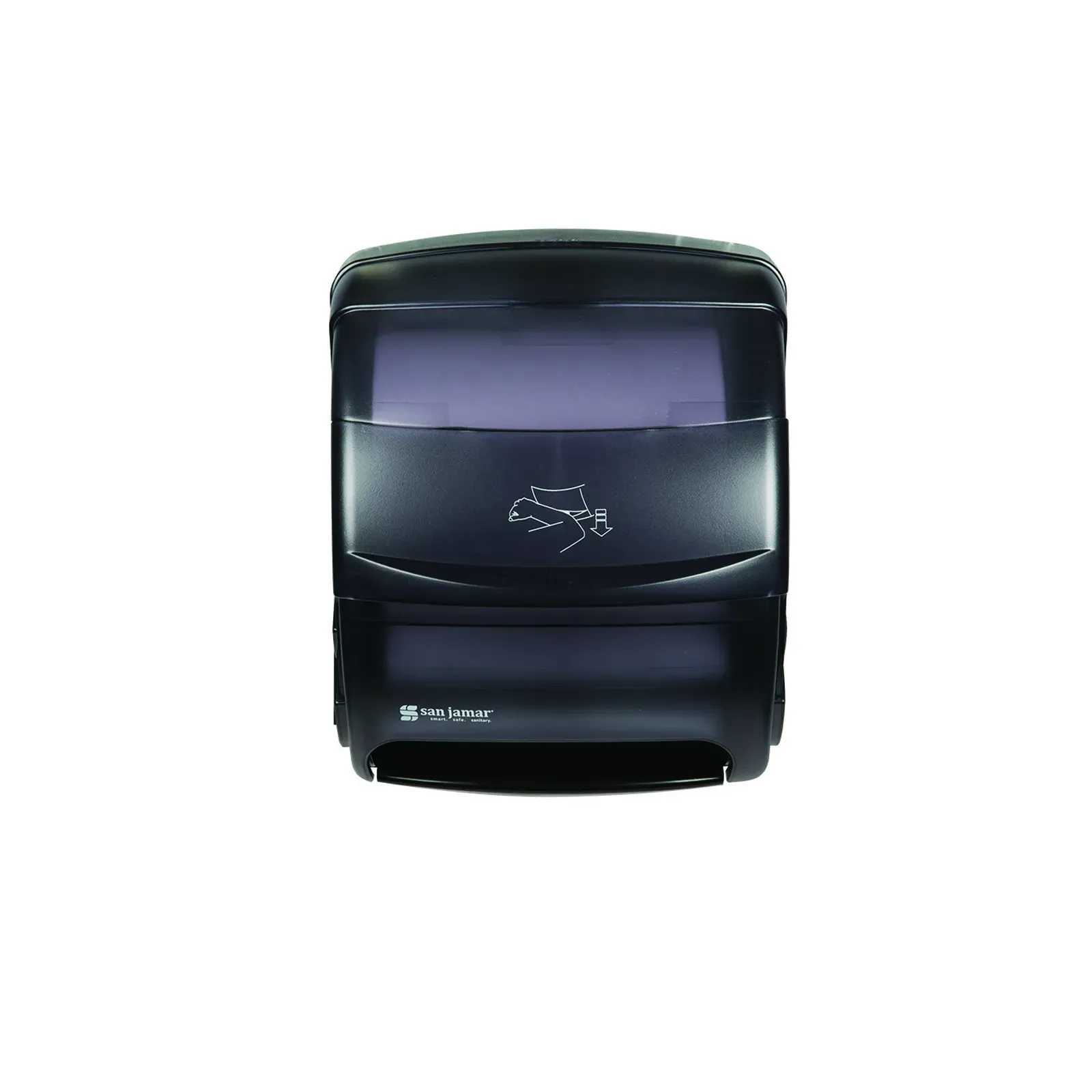 Introducing the San Jamar T850TBK Paper Towel Dispenser, the perfect addition to any commercial restaurant seeking to foster sustainability. This Integra Level Roll Towel Dispenser is designed to meet the needs of busy restaurant environments, offering convenience and efficiency. With its compact dimensions of 11-1/2"W x 11-1/4"D x 13-1/2"H, it can easily fit into any space. The dispenser can hold one 8-1/4" wide roll with an 8-1/2" diameter, ensuring a steady supply of paper towels for your staff and customers. Its translucent black pearl finish adds a touch of elegance to your establishment. Made by San Jamar, a trusted name in the industry, this dispenser is built to last. Improve hygiene and reduce waste with the San Jamar T850TBK Paper Towel Dispenser, the ideal choice for commercial restaurants.