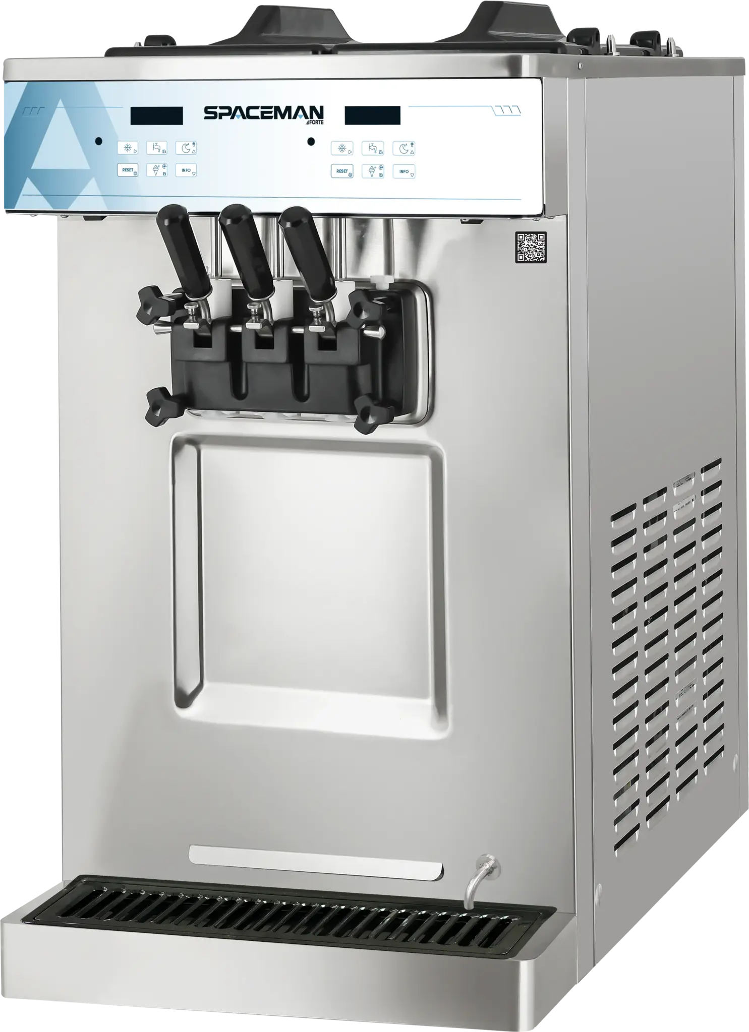 The 6235A-C is a premium twin twist (two flavor) countertop, pressurized (air pump) soft serve machine designed for operators who want versatility, high output, and consistent product quality. With patented freezing technology on its 1.8qt cylinders, the 6235A-C achieves super-fast recovery times and can produce over 350 4oz servings per hour, making it a reliable choice for busy operations. Capable of producing a variety of soft serve products including ice cream, frozen yogurt, custards, and sorbets, it combines speed with flexibility for a wide range of applications. At the heart of its performance is Spaceman’s patented 100% Controlled Contact Flooded Evaporator, engineered for maximum efficiency and delivering the industry’s fastest freeze-down and recovery times with smaller ice crystals and the smoothest, creamiest mouthfeel. Continuous improvements in design, based on operator feedback and R&D, enhance structural integrity, improve serviceability, and reduce failure points. The advanced V5 single-piece auger eliminates unnecessary parts, reduces cleaning time, ensures 100% evaporator wall contact, and delivers unmatched consistency with the smallest ice crystals in the industry. Smart safety controls and independent standby modes maintain hopper and cylinder temperatures below 4.4ºC (40ºF), ensuring product quality and conserving energy during non-use. Inverter motor control further enhances durability by allowing three-phase motors to run on single-phase power input, reducing torque and start-up strain and significantly minimizing gearbox and drivetrain failures caused by freeze-ups or operational errors. The 6235A-C features Spaceman’s advanced pressurized air pump system, designed for compatibility with a wide range of products and engineered with fewer parts for easier use, cleaning, and maintenance. Its oversized pump and control system keep the freezing cylinders consistently full to prevent product starvation while allowing operators to choose between six adjustable overrun settings. This flexibility lets users create creamier, fluffier, lighter products while maximizing profitability. Separate hopper cooling controls allow each hopper to be independently managed, preventing freezing along the sides and pre-chilling mix for maximum output and consistency. Dual digital user interfaces simplify operation, while hopper agitators keep mix stirred throughout the day for consistent dairy-safe cooling. (When paired with a cart, the 6235A-C also serves as a direct replacement for the 6250-C.)