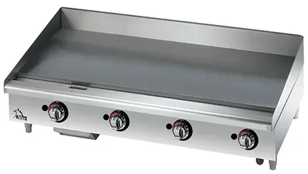 Star-Max®manual gas griddles are a perfect match for the budget minded operator. For breakfast, lunch or dinner, the Star-Max manual control griddles out-perform the competition. Star-Max® griddles feature 1” thick polished steel griddle plate and are available in 15”, 24” 36” and 48” widths. 28,300 BTU aluminized burner every 12” of width controlled by a modulating thermostatic, 3/4” N.P.T. male gas connection with convertible pressure regulator, and 4” adjustable legs. Griddles operate on Natural or Propane gas.