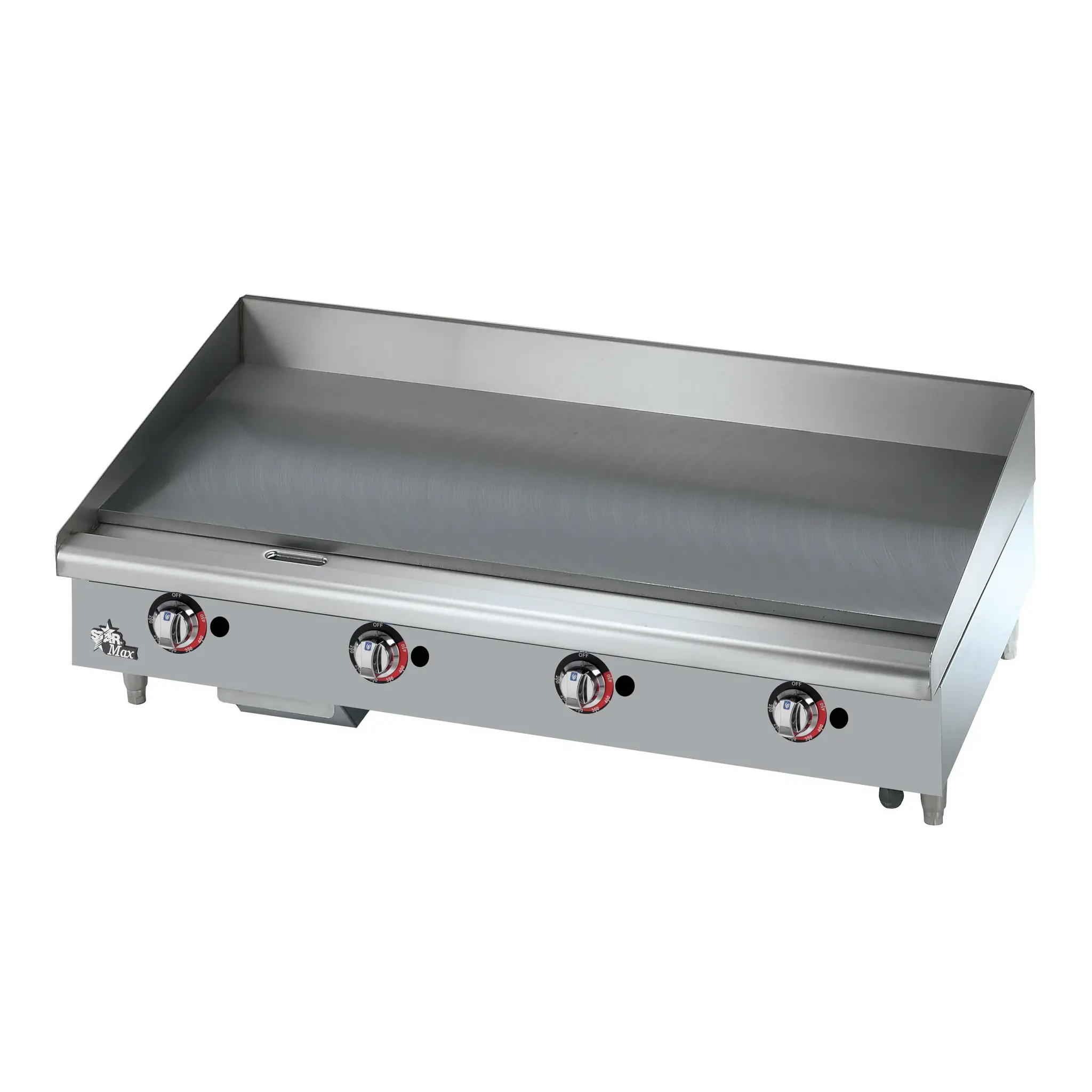 Optimize your kitchen efficiency with the Star, 648TSPF, Gas Countertop Griddle. This heavy-duty griddle is designed to meet the demands of a commercial restaurant setting. With a 48" wide by 21" deep cooking surface and a 1" thick steel griddle plate, it provides ample space for cooking a variety of dishes. The electronic snap-action thermostat, located every 12 inches, ensures precise temperature control for consistent cooking results. The heavy-duty knobs and wrap-around stainless steel splash guard add durability and ease of use. The grease trough and stainless steel drawer make cleaning a breeze, while the welded steel frame with a stainless steel front and 4" legs provide stability and support. With a powerful 113200 BTU, this griddle delivers high-performance cooking. Made in the USA and cULus and UL EPH Classified, this Star griddle is a reliable and authentic choice for any commercial kitchen.