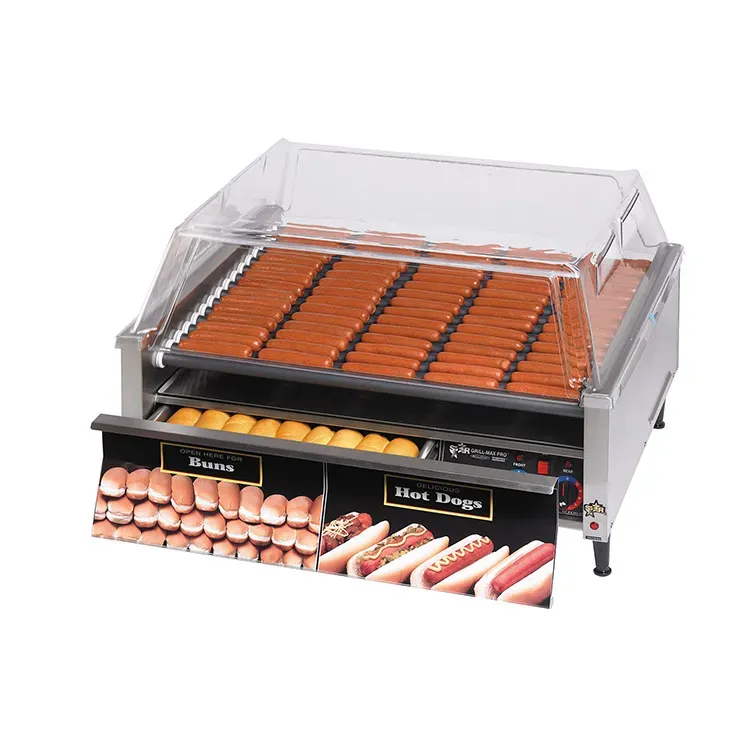 Master your restaurant's kitchen with the Star 75SCBD Hot Dog Grill. This roller-type grill is designed to meet the demands of a commercial restaurant, offering a capacity of 75 hot dogs and 48 buns. The integrated bun drawer ensures that your buns are always warm and ready to serve. The Duratec coated non-stick rollers make it easy to cook and clean, saving you time and effort. With analog controls for the front and rear zones, you have precise control over the cooking process. The stainless steel construction not only ensures durability but also adds a sleek and professional look to your kitchen. This hot dog grill is cULus and UL EPH Classified, guaranteeing its safety and quality. Made in the USA by Star, a trusted vendor in the industry, this hot dog grill is a must-have for any commercial restaurant looking to serve delicious hot dogs efficiently.