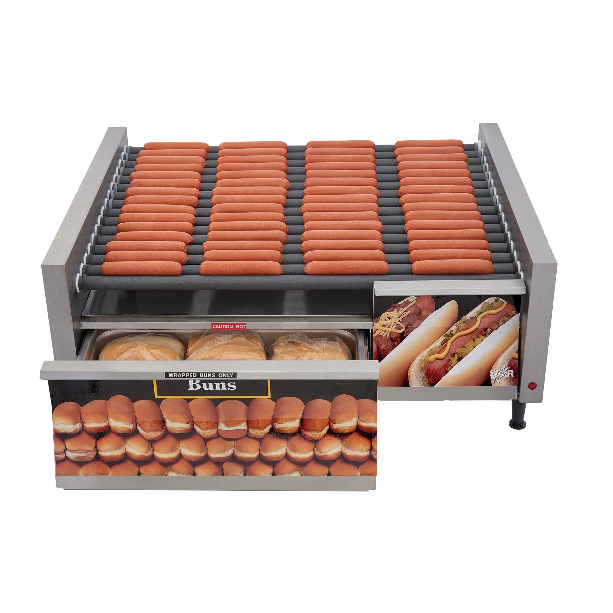 Cook with precision using the Star 75SCBDE Hot Dog Grill. This roller-type grill is perfect for commercial restaurant use, offering a capacity of 75 hot dogs and 48 buns. The integrated bun drawer ensures convenience and efficiency, allowing you to serve up delicious hot dogs with ease. The Duratec coated non-stick rollers guarantee even cooking and easy cleaning, while the programmable electronic controls for front and rear zones provide precise temperature control. Made with stainless steel construction, this hot dog grill is durable and built to last. It is cULus and UL EPH Classified, ensuring its safety and quality. Whether you're running a stadium seating restaurant or a food truck, the Star 75SCBDE Hot Dog Grill is the perfect addition to your kitchen. Trust in its reliability and enjoy serving up mouthwatering hot dogs to your customers.