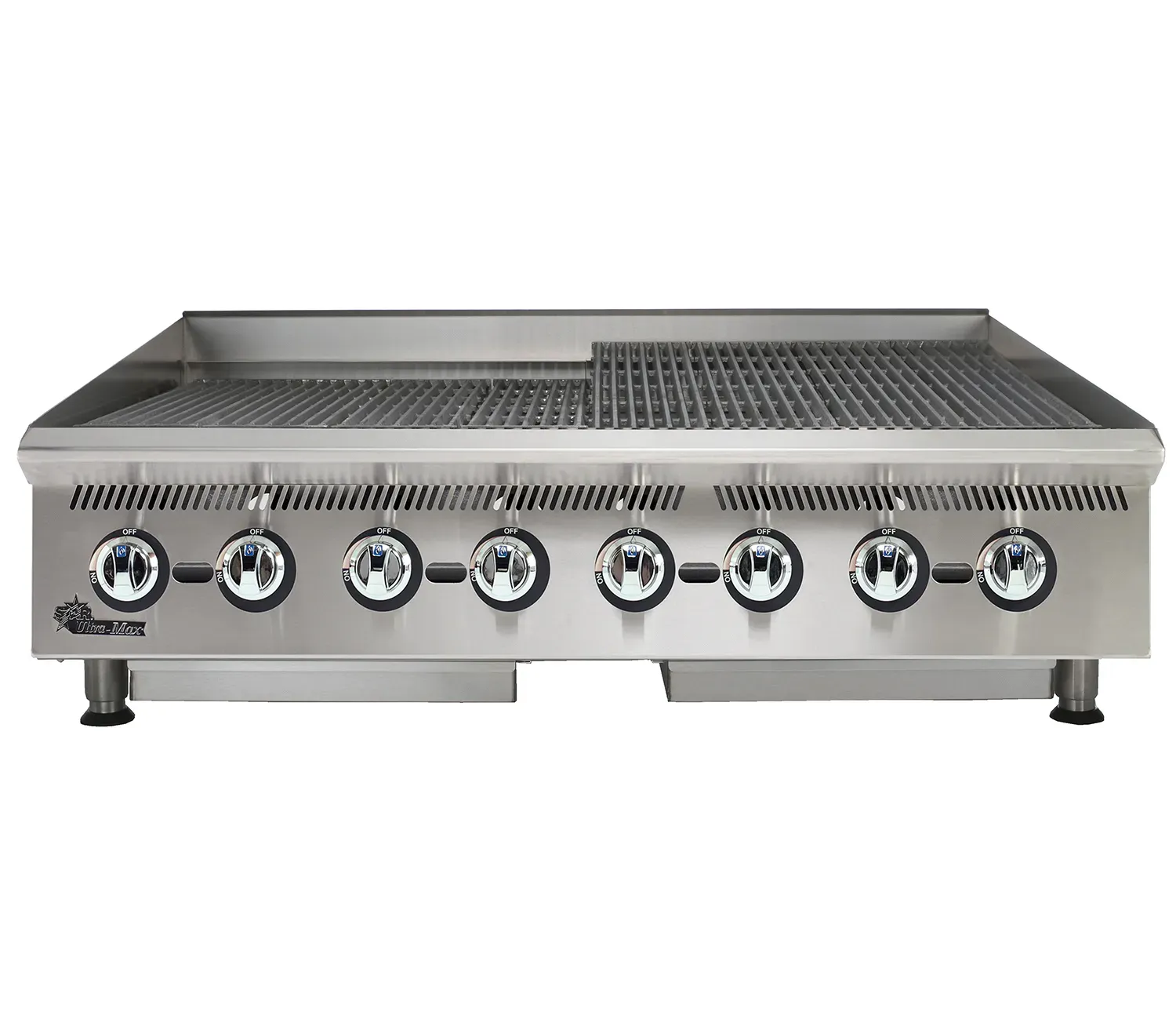 The Ultra-Max® radiant and lava rock charbroilers are constructed in the U.S.A. with a corrosion-resistant stainless steel body. The charbroilers will either use lava rocks or heavy- duty radiants to transfer heat to product. Grates are adjustable per section to be enclined or flat. The units feature cast iron burners which produce 20,000 BTUs per six 6 inches of width and have adjustable valves and a standing pilot. Units will be shipped being set up for Natural Gas, and will include field conversion kit for LP gas. Standard gas connection is 3/4-inch N.P.T. For lava rock models, a five 5 pound bag of lava rocks will be provided for each twelve 12 inches of width.