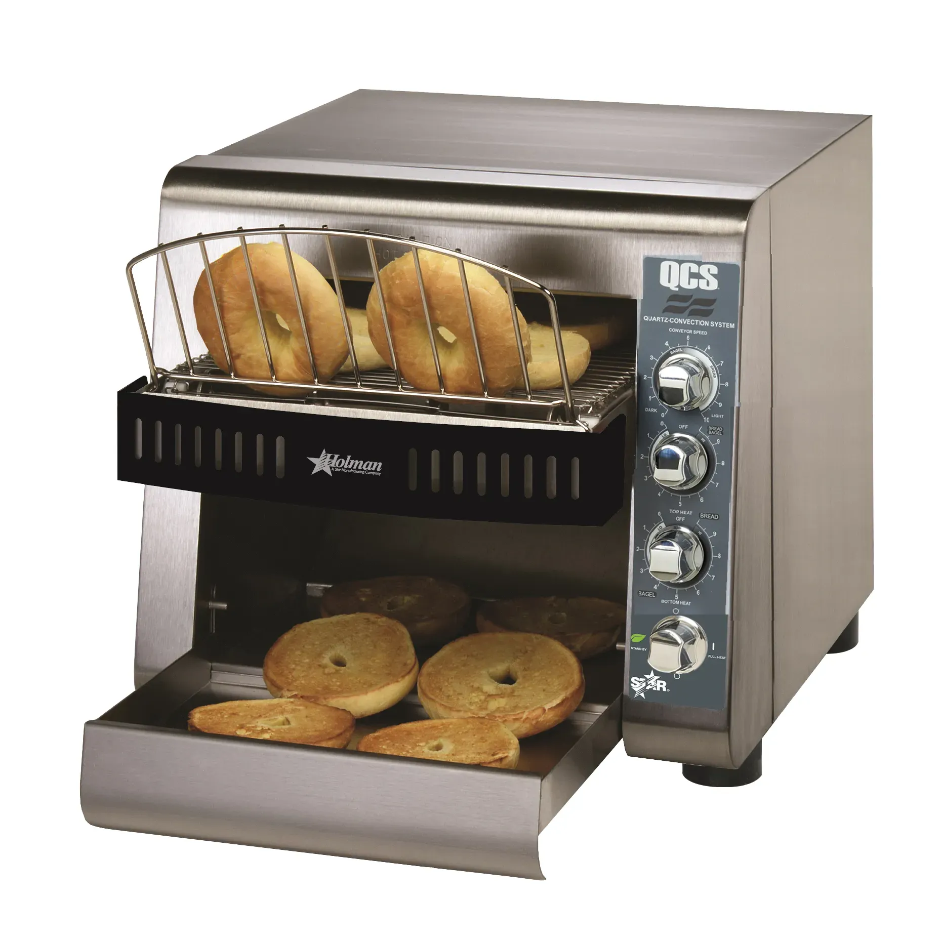 Introducing the Star QCS2-1200B Toaster, Conveyor Type - the perfect solution to simplify restaurant operations. Designed by Star, a trusted vendor in the industry, this electric conveyor toaster is a game-changer for commercial restaurants. With a capacity of 1200 slices per hour, this toaster can handle high-volume demands with ease. The horizontal conveyor and analog speed control ensure consistent and efficient toasting, while the independent controls for the top-only quartz sheathed heater elements allow for precise customization. The 1-3/4" opening and 10" W belt with loading rack make it ideal for toasting bagels and other bread products. Made with stainless steel construction and a smooth cool touch exterior, this toaster is not only durable but also safe to use. It is cULus and UL EPH Classified, guaranteeing its quality and compliance with safety standards. Upgrade your restaurant's toasting capabilities with the Star QCS2-1200B Toaster, Conveyor Type.