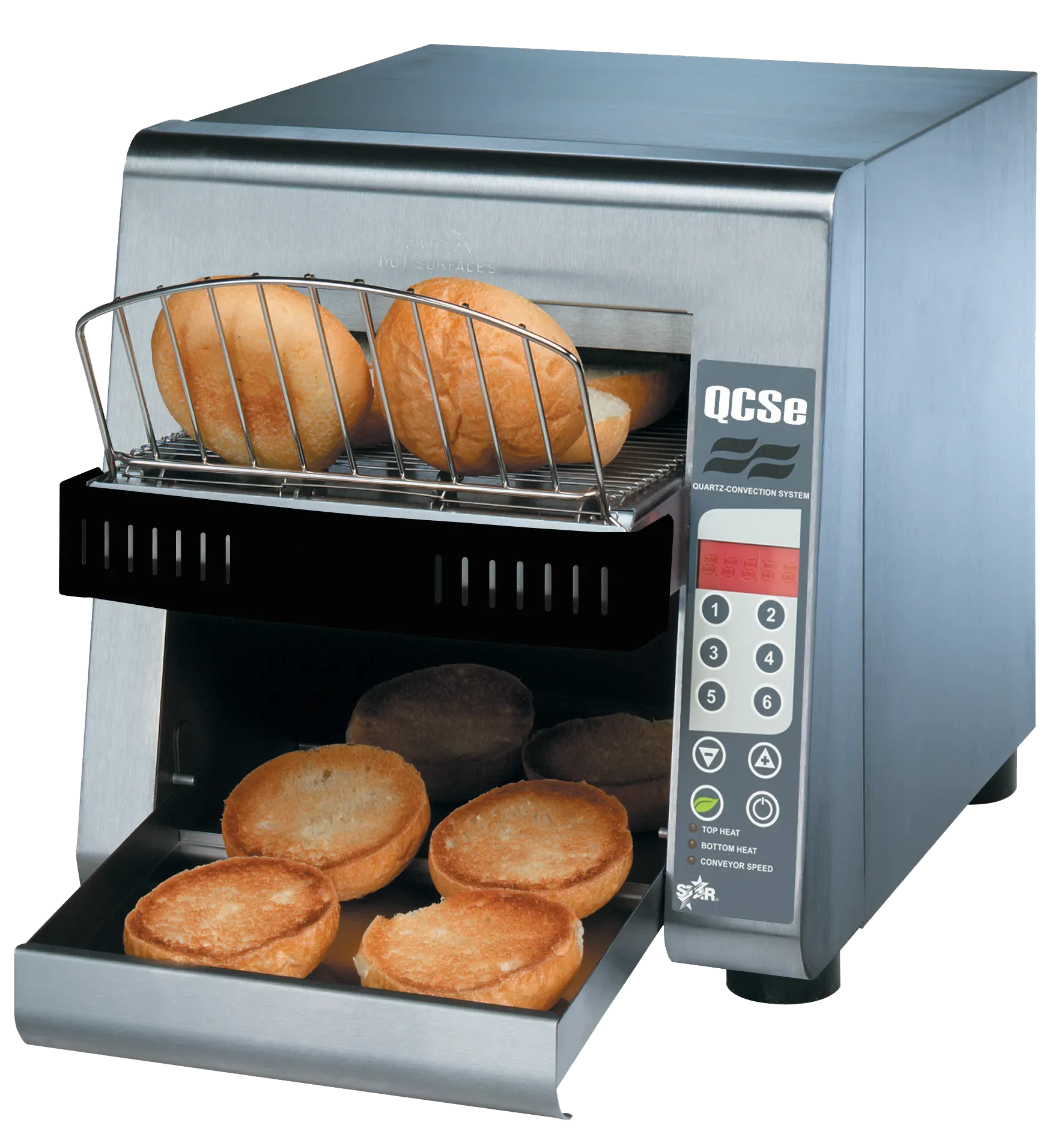 Star’s QCSe2-600H conveyor toaster can generate up to 600 slices per hour without taking up too much counter space. The QCSe2-600H features programmable electronic controls, a 3" product opening, 10" wide variable speed conveyor belt, and independent top and bottom heat controls. Star’s forced convection system keeps the toaster cool-to-the-touch and extends the life of critical components. Stainless steel construction is used for long lasting durability and the heavy-duty motor utilizes a drive chain for superior reliability.