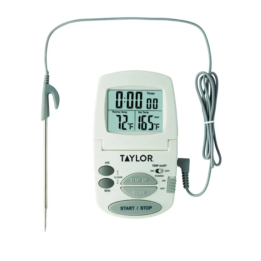 Improve efficiency with the Taylor Precision 1470FS Thermometer. Designed for commercial restaurant use, this digital oven thermometer and timer is a must-have tool for precise cooking. With a temperature range of 32 to 392°F (0 to 200°C), it ensures accurate readings every time. The 1.5mm stainless steel stepdown probe and 4-foot silicone cord allow for easy monitoring of food without the risk of burns. FDA recommended, this thermometer guarantees food safety and quality. The on/off switch and foldable design make it convenient to use and store. Plus, the magnet on the back allows for easy mounting on the stove. Upgrade your kitchen with this reliable and efficient thermometer.
