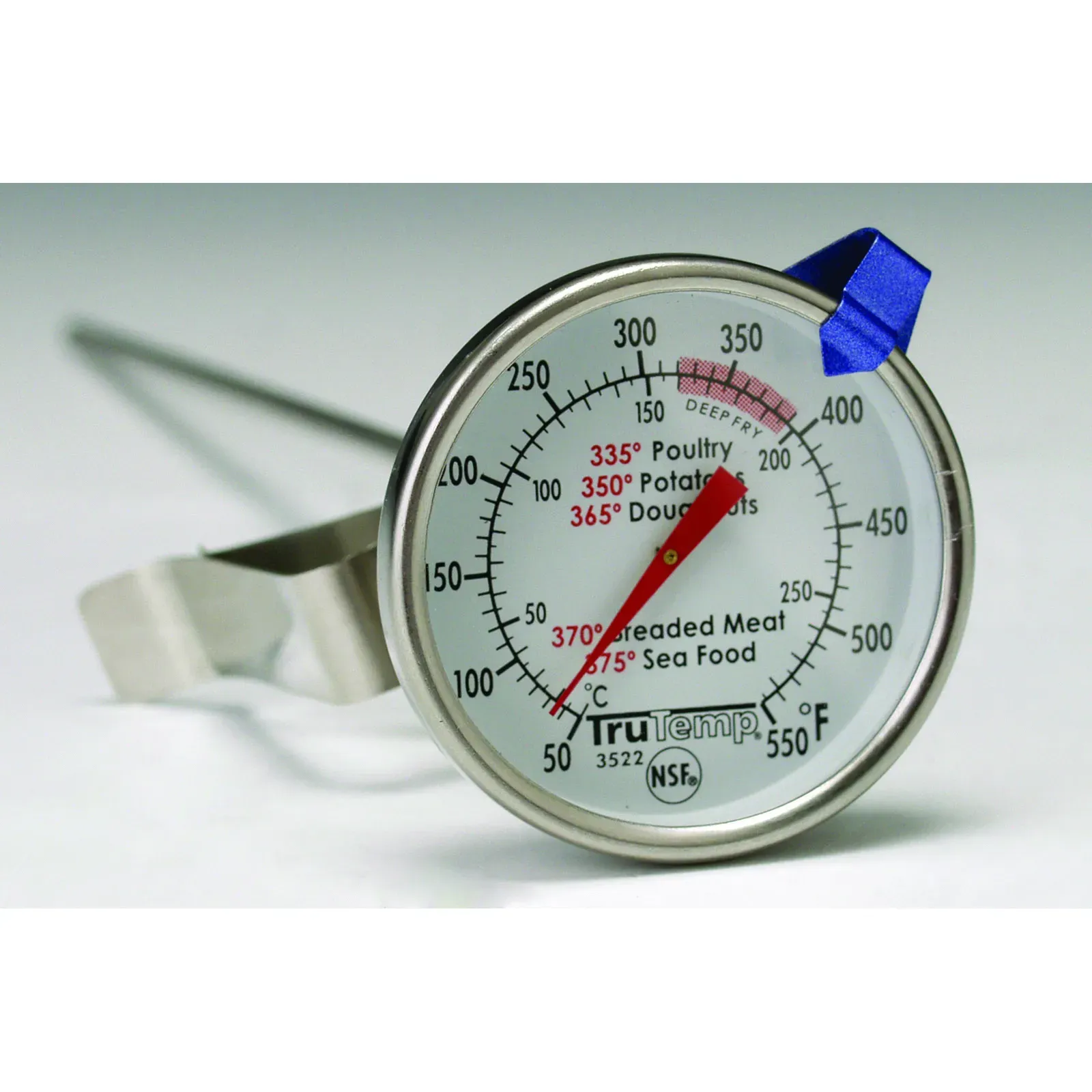 Enhance kitchen precision with the Taylor Precision 3522FS Deep Fry / Candy Thermometer. Designed specifically for commercial restaurant use, this thermometer ensures accurate temperature readings for deep frying and candy making. With a temperature range of 50°F to 550°F (50°C to 285°C), you can easily monitor the heat of your oil or sugar syrup to achieve perfect results every time. The 12" stainless steel stem is equipped with an adjustable pan clip, allowing you to securely attach the thermometer to your cooking vessel. The 1-3/4" dial features an adjustable temperature indicator, making it easy to set and maintain the desired temperature. NSF certified for food safety, this thermometer is a must-have tool for any professional kitchen. Trust Taylor Precision for reliable and accurate temperature measurement in your commercial kitchen.