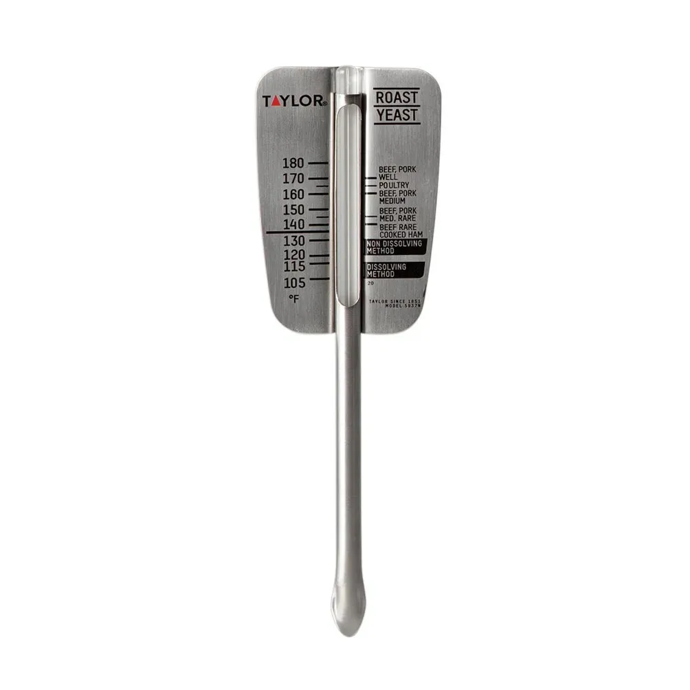 Innovate measurements with the Taylor Precision, 5937N, Meat Thermometer. This multi-purpose thermometer is a must-have for any commercial restaurant. With a temperature range of 105° to 185°F, it ensures accurate readings for all your meat dishes. The armored sabre-tipped non-toxic liquid filled tube guarantees durability and safety, making it perfect for busy kitchen environments. Made of stainless steel, this thermometer is dishwasher safe, allowing for easy cleaning and maintenance. Each unit is blister carded and NSF certified, ensuring its quality and reliability. Whether you're grilling, roasting, or frying, this thermometer will help you achieve perfectly cooked meats every time. Upgrade your kitchen tools with the Taylor Precision, 5937N, Meat Thermometer and elevate your culinary creations.