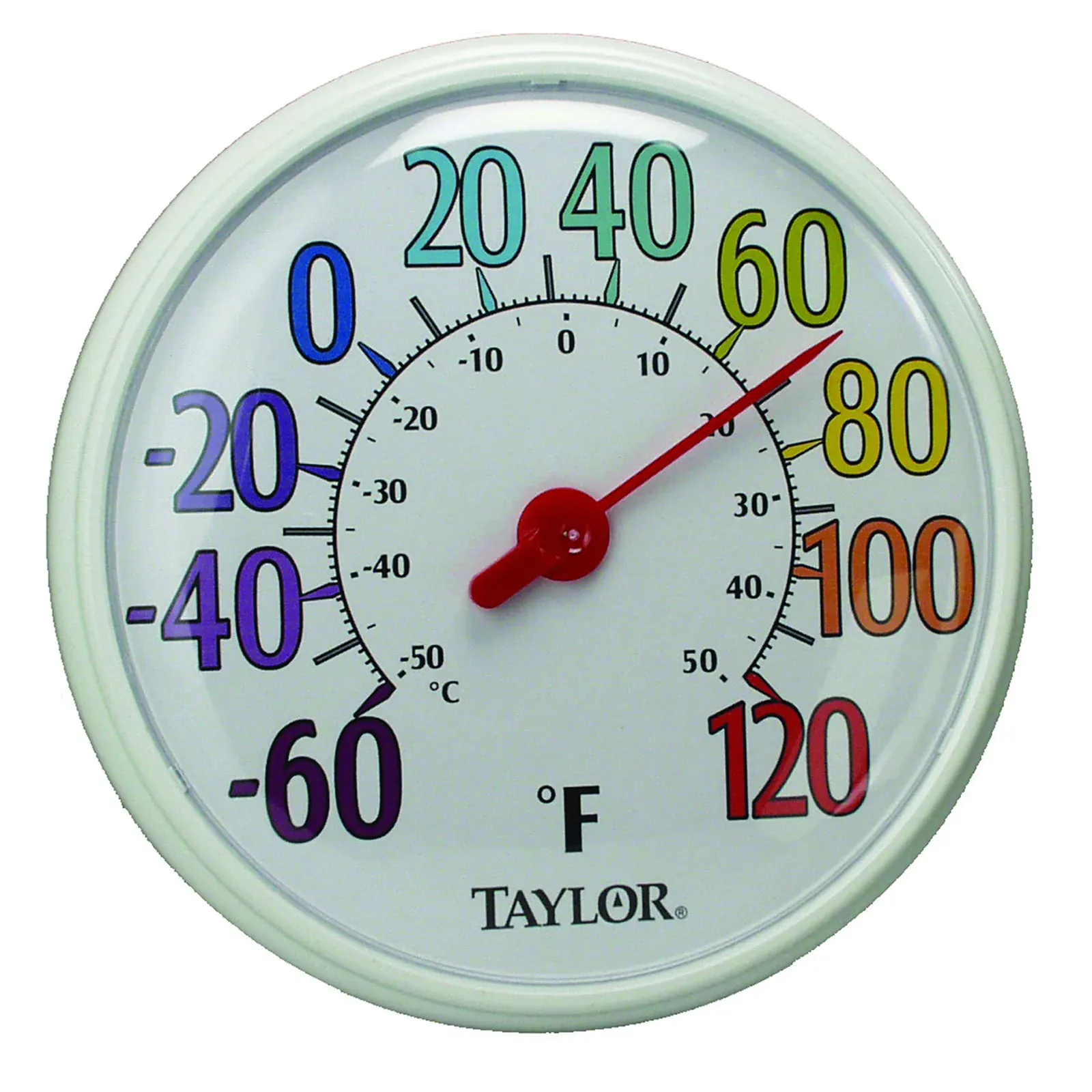 Streamline for results with the Taylor Precision 6714 Thermometer, Window Wall. This indoor/outdoor dial thermometer is designed to meet the needs of commercial restaurants, providing accurate temperature readings in a bright and colorful display. With a 13-1/4" dial and ColorTrak design, this thermometer is easy to read from a distance, allowing chefs and staff to monitor temperatures with ease. The temperature range of -60 to 120F (-50 to 50 C) ensures that it can handle the extreme conditions often found in busy kitchens. The glossy white bezel frame adds a touch of style, while the weather-resistant and shatterproof construction ensures durability in any environment. Sold in case quantities of 4, the Taylor Precision 6714 Thermometer is a reliable and practical choice for commercial restaurant use.