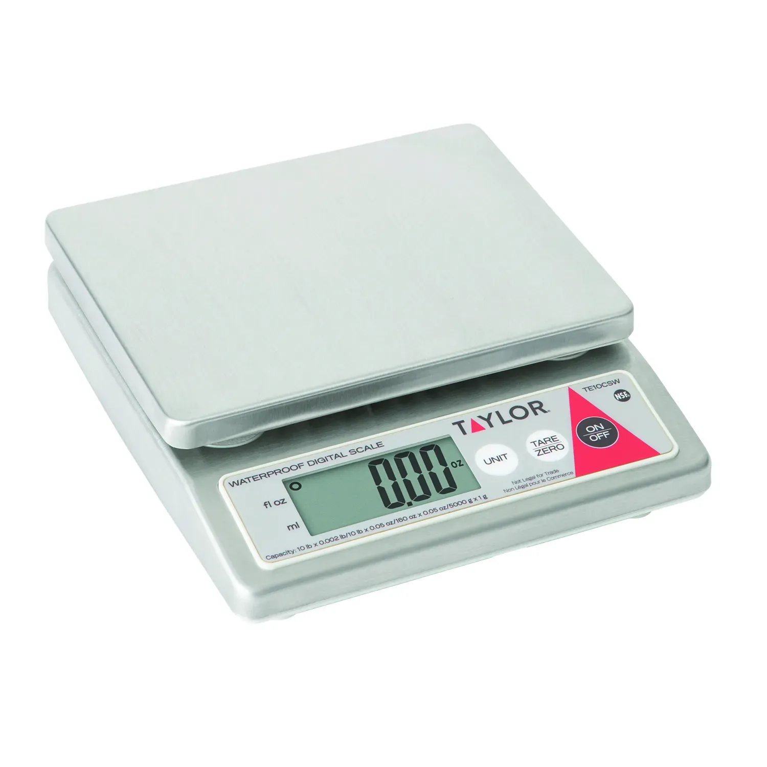 Improve efficiency with the Taylor Precision TE10CSW digital stainless steel scale. Designed for commercial restaurant use, this compact scale offers a 10lb/5kg water-resistant capacity, making it perfect for portion control. With its precise measurements of 10 lb. x 0.002 lb / 10 lb. x 0.005 oz. / 160 oz. x 0.05 oz. / 5000 g x 1 g for dry ingredients and 160 fl. oz x 0.05 fl. oz / 5000 ml x 1 ml for liquids, you can accurately measure both solid and liquid ingredients. The 4.75" x 5.9" stainless steel platform is easy to clean and maintain, ensuring food safety and hygiene. The scale features a tare function, auto-off and disable auto-off function, low battery and overload indicators, and a field calibration feature. It can be powered by an AC adapter or a 9V battery. With its waterproof and NSF-certified construction, this Taylor Precision scale is a reliable and durable addition to any commercial kitchen.