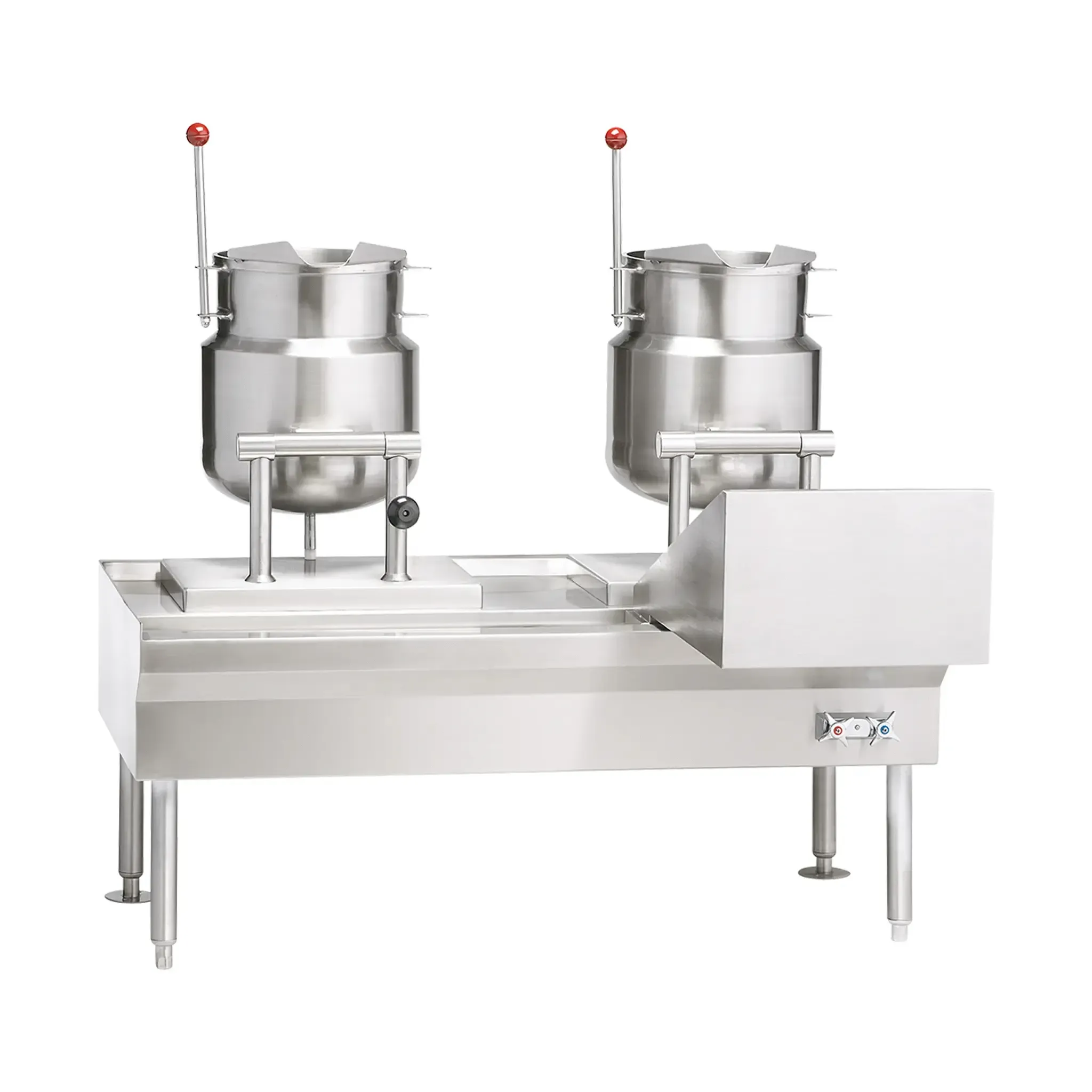 Master the art of flavor with the Vulcan VEKT64/126 Kettle Cabinet Assembly. This electric tilting kettle is a must-have for any commercial restaurant looking to elevate their culinary creations. The VEKT64/126 model includes both a K12ETT and a K6ETT electric tilting kettle, providing versatility and efficiency in one package. The 64" wide stand features a full-length drain trough, allowing for easy cleanup and maintenance. The dual temperature control ensures precise cooking, while the stainless steel construction guarantees durability and longevity. With a stainless steel table top, drain trough, sides, back, and legs with flanged feet, this kettle cabinet assembly is built to withstand the demands of a busy kitchen. UL certified for safety, this Vulcan product is a reliable and trusted choice for professional chefs. Upgrade your restaurant's cooking capabilities with the Vulcan VEKT64/126 Kettle Cabinet Assembly and unlock a world of culinary possibilities.