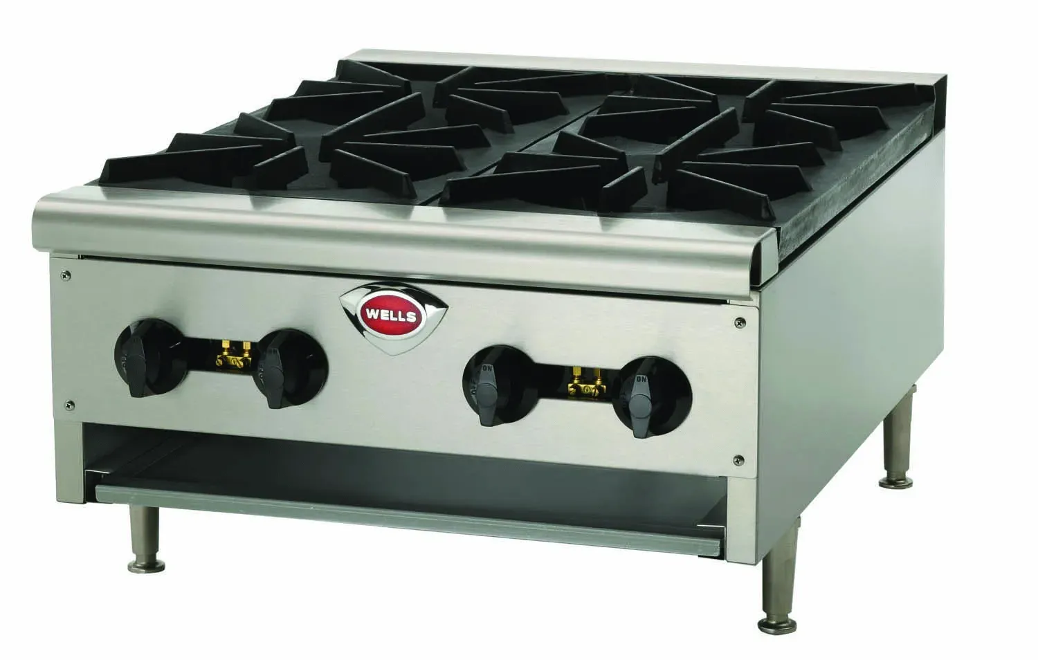 Wells HDHP-2430G Gas Countertop Hot Plates features extra heavy-duty cast iron burners and top grates for higher heat, consistent temperatures, and quick recovery. Each burner features operator adjustable infinite heat adjustment and On/Off control and adjustable air shutter to control air and optimize combustion. Stainless-steel front and side panels, removable drip pan for ease of clean-up and adjustable 4" heavy-duty steel legs. Ships in natural gas and are field convertible to LP Gas. 86K BTU, and 4 burners.